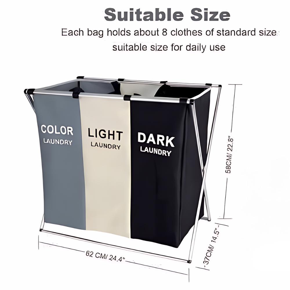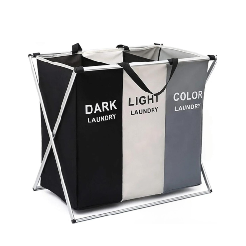 - ثلاثة أقسام: تحتوي السلة على ثلاثة أقسام منفصلة، مخصصة للملابس الداكنة والفاتحة والملونة، مما يسهل عملية فرز الملابس قبل الغسيل.